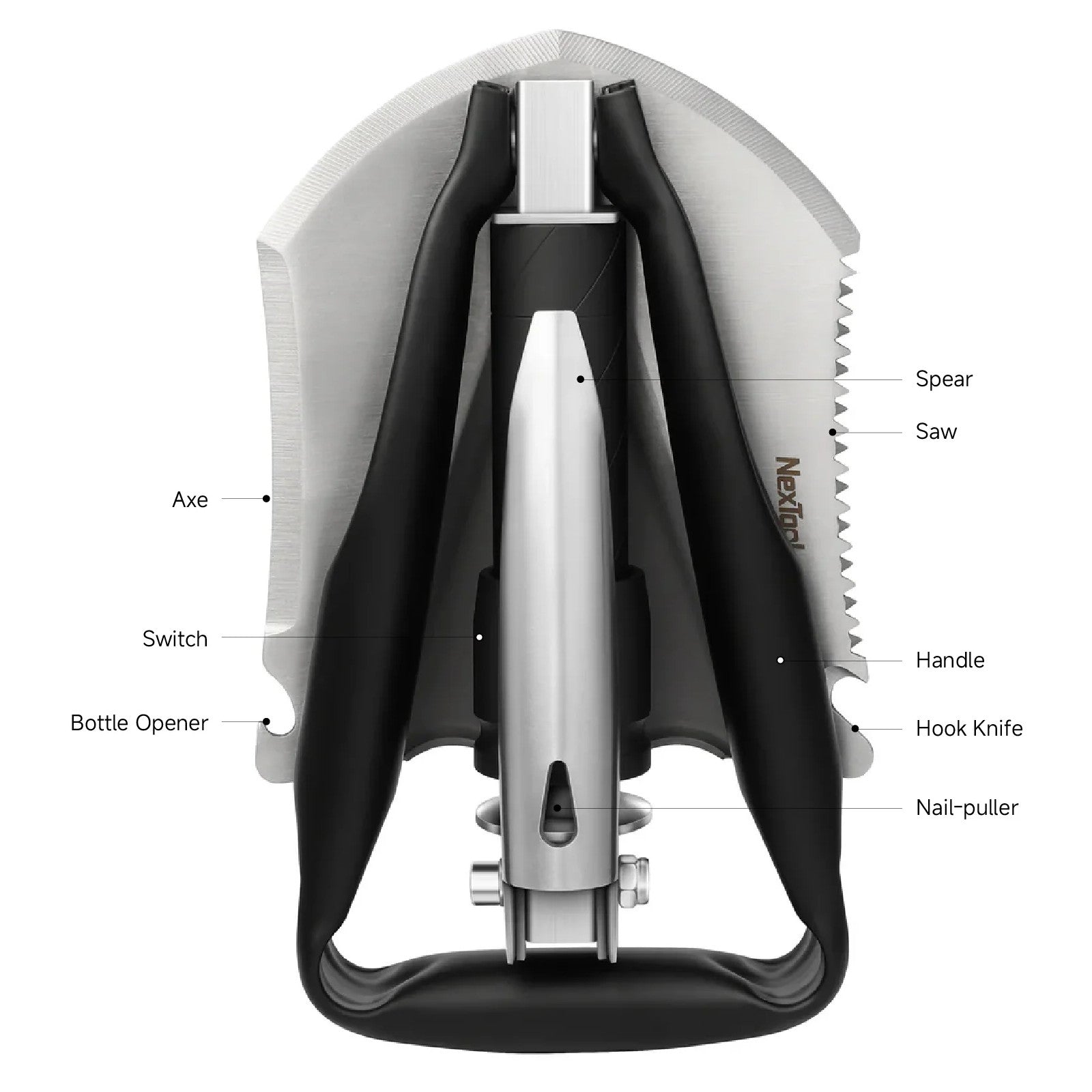 Shovel, Axe, Pickaxe, Saw, Hoe (Shovel folded 90°), Hook-Knife, Bottle-Opener, Nail-Puller